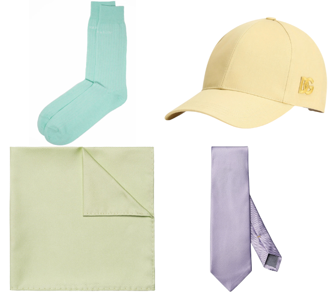 If your starting point is all-black everything, then head-to-toe-pastels might be a tall hill to climb. A pair of socks or a baseball cap can be an easy entry point, or – if you’re dressing for a formal occasion – a silk tie or pocket square.