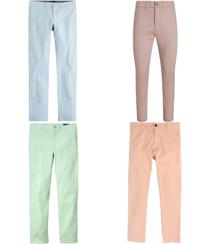 There was a time when chinos were synonymous with shades of khaki and stone, but today they span the entire rainbow. While anything is, in theory, possible, these generally look best cut slim in slightly washed out shades of pink, blue and green.